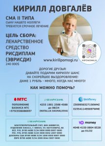 Кирилл совсем маленький и уже сейчас ему нужна Ваша помощь в приобретении препарата EVRYSDI (Рисдиплам), который остановит СМА (Спинальная мышечная атрофия – генетическое нервно-мышечное заболевание, приводящее к нарастающей слабости. Заболевание носит прогрессирующий характер с дебютом в разном возрасте. Слабость начинается с мышц, отвечающих за глотание и дыхание).