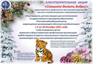 6 декабря в Гомельской областной организации профсоюза работников торговли, потребительской кооперации и предпринимательства дан старт благотворительной акции “Спешите делать добро!” среди первичных профсоюзных организаций по сбору подарков, детских игрушек к новогодним праздникам для воспитанников Государственного учреждения образования “Рогачёвский центр коррекционно-развивающего обучения и реабилитации”.